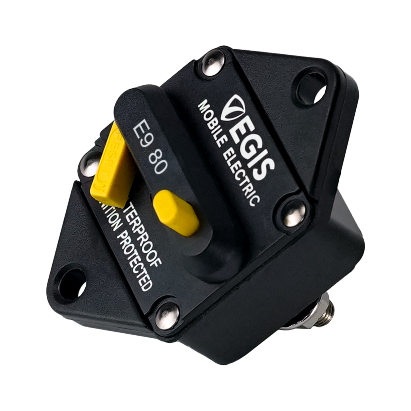 The Thermal Circuit Breaker 80 A, Panel Mount features include: - Protection for Electrical Circuits from short circuit thermal overloads - Provides robust manual circuit switching for reliable live load switching - Harsh environment capable. Sealed, ignition protected, stainless steel self-locking hardware. - High voltage rating and short-circuit interrupt current capability protects circuits connected to large series or parallel battery banks.
